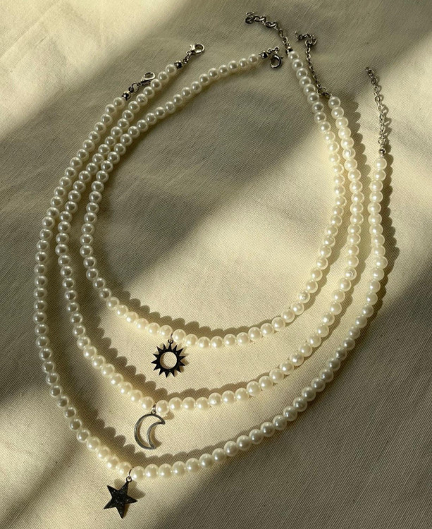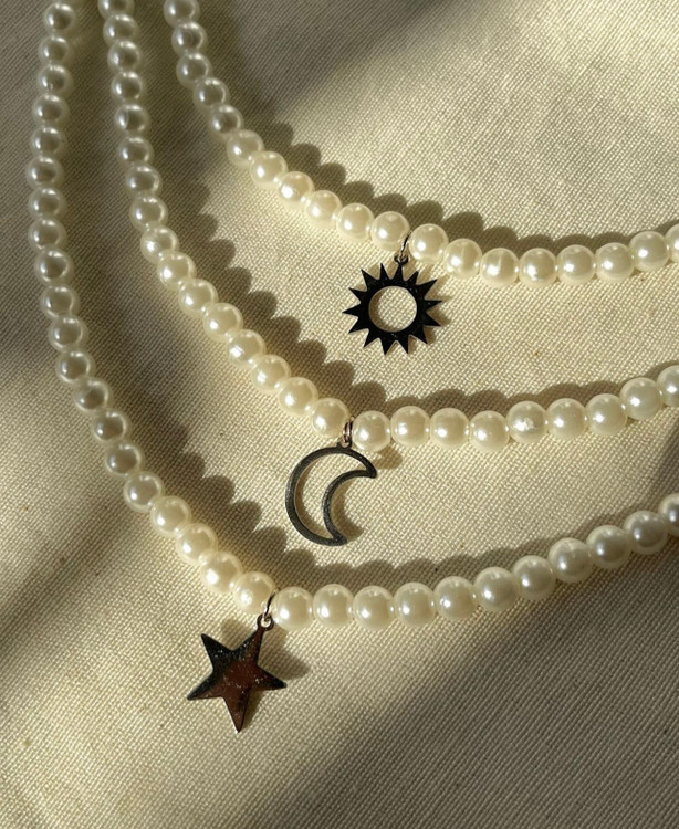 گردنبند مروارید با پلاک استیل ماه، خورشید، ستاره